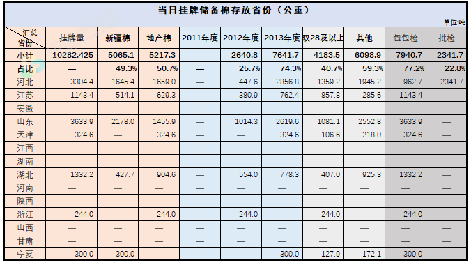 2.当日轮出上市储备棉中有部分为分批抽样公检。抽样比率及抽样方法按照棉花国家标准规定,品质指标包括颜色级、轧工质量、长度、马克隆值、断裂比强度、长度整齐度指标;重量采用原入库公检结果,不再重新检验。