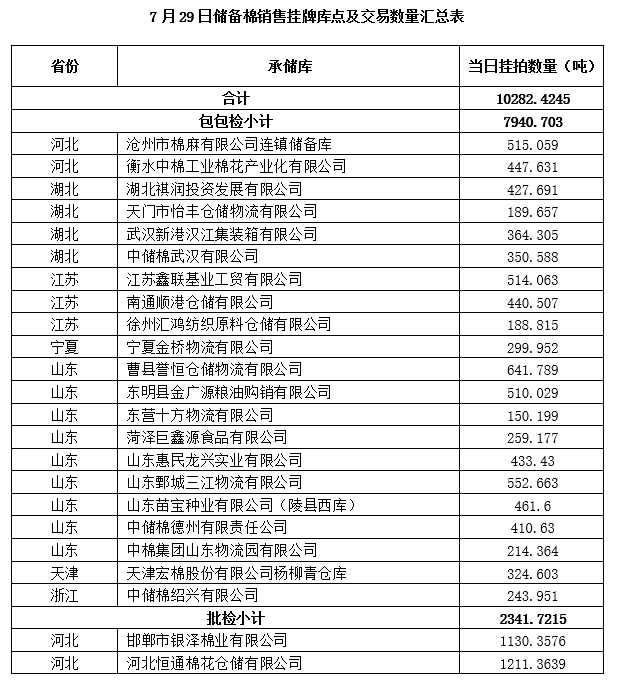 中国储备棉管理有限公司定于7月29日上市销售储备棉重量10282.4245吨,共48捆。