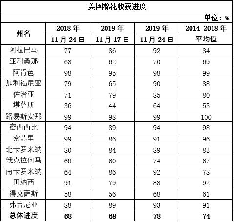 11月25日美国农业部发布的美国棉花生产报告显示,截至2019年11月24日美棉收获进度78%,较前周增加10个百分点,比去年同期增加10个百分点,比过去5年同期增加4个百分点。