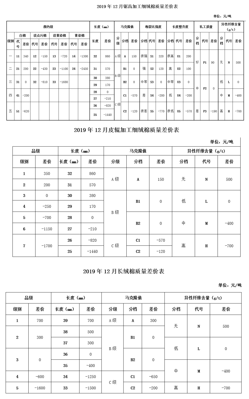 依据2019年11月的棉花公检质量数据、中国棉花协会棉花质量价差自动生成系统采集的棉花加工企业销售成交价、纺织企业监测点的采集数据及当月的中国棉花价格指数,2019年12月锯齿加工细绒棉质量差价调整数据据此生成,并征求业内相关专家意见,现做出如下调整(单位:元/吨):