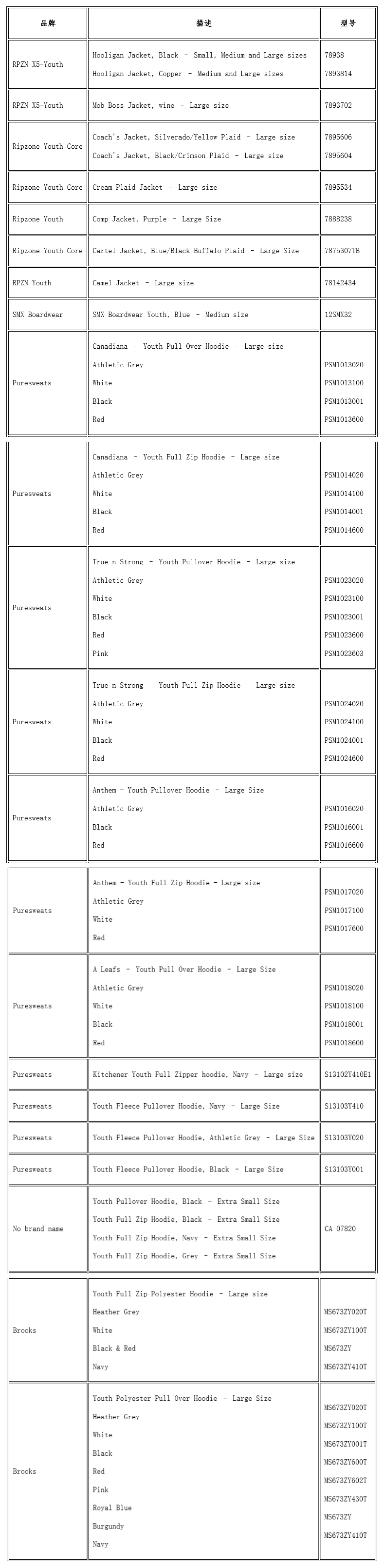 此次召回产品为儿童外套,帽子或腰部有拉绳和扣子。具体召回产品如下: