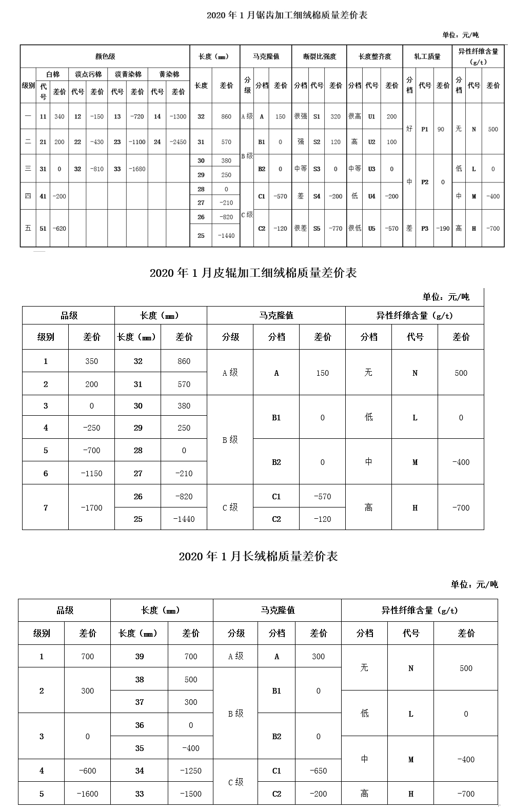 根据《中国棉花协会国产棉质量差价表管理办法》规定,现正式发布2020年1月《锯齿加工细绒棉质量差价表》、《皮辊加工细绒棉质量差价表》和《长绒棉质量差价表》(单位:元/吨)。