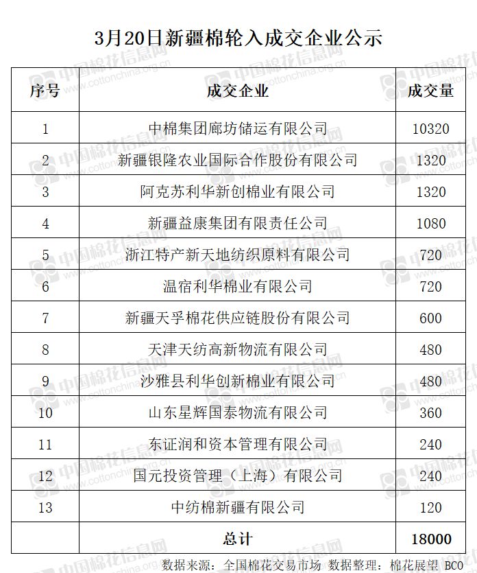 3月20日,中国储备棉管理有限公司计划采购新疆棉18000吨,实际成交18000吨,成交率100%,成交均价12122元/吨。 其中内地库成交18000吨。