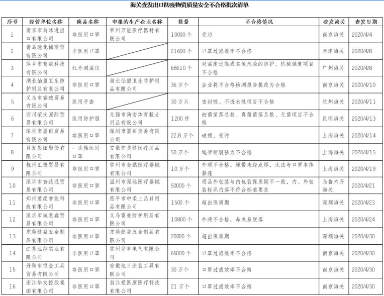 海关总署公布全国海关近期查发出口防疫物资质量安全不合格批次清单