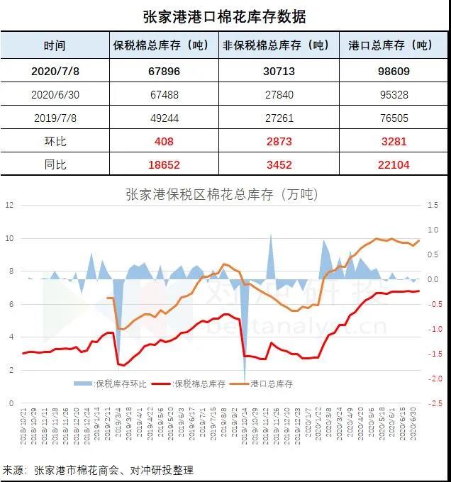据张家港市棉花商会,截止2020年7月1日,张家港非保税棉30713吨,保税棉67896吨,共98609吨。进区3967吨,出区660吨。