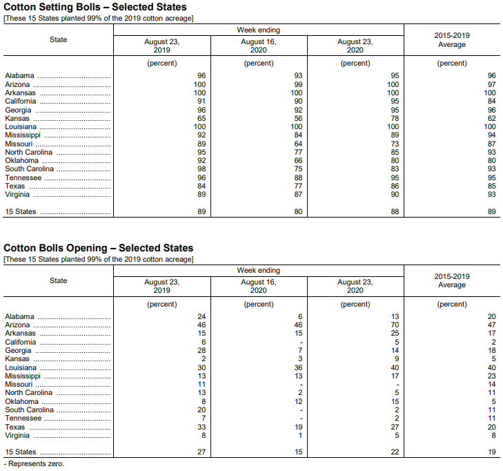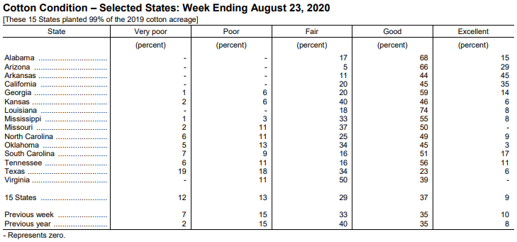 美国农业部8月24日发布的美国棉花生产报告显示,截至8月23日,美棉蕾铃率为88%,前周为80%,去年同期为89%,5年均值为89%。美棉吐絮进度为22%,前周为15%,去年同期为27%,5年均值为19%。美棉优良率为46%,前周为45%,去年同期为43%;其中得州优良率为29%,较前周增加2个百分点,差苗率为37%,较前周增加4个百分点。