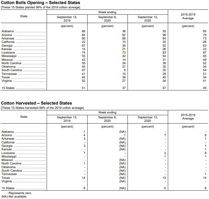 美国农业部9月14日发布的美国棉花生产报告显示,截至9月13日当周,美棉吐絮进度为47%,前周为37%,去年同期为51%,5年均值为45%。美棉收获进度为6%,去年同期为8%,5年均值为8%。美棉优良率为45%,前周为45%,去年同期为41%。