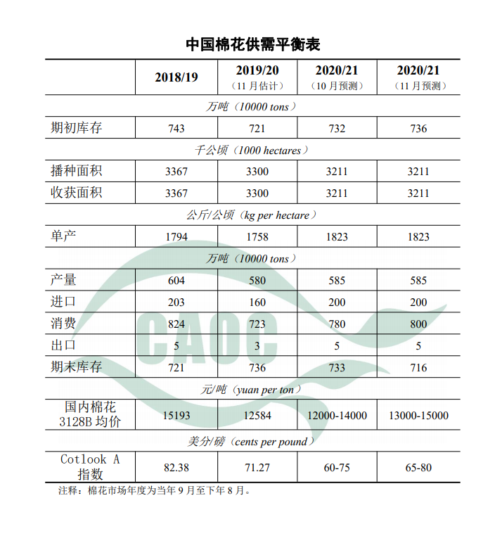 2020/21年度棉花采摘进入收尾阶段,全国主要棉区天气晴好,利于棉花采摘。截至10月底,全国新棉采摘进度为86.3%,同比提高0.8个百分点,籽棉交售量和皮棉加工量均高于上年同期。本月预测,2020/21年度棉花产量维持上月不变。10月以来,国内经济形势向好,棉纺织行业订单回暖超出预期,同时国外受疫情影响,下游订单向国内转移进一步放大国内需求,年度棉花消费较上月调增20万吨至800万吨,期末库存调减至716万吨,棉花均价预测区间调增为每吨13000-15000元。2020/21年度全球棉花生产比上年度小幅下降,消费有所增长,国际棉价出现小幅上涨,但考虑到全球棉花库存仍保持高位,海外疫情有加重趋势,经济前景仍不明朗,国际棉价区间小幅调增至每磅65-80美分。