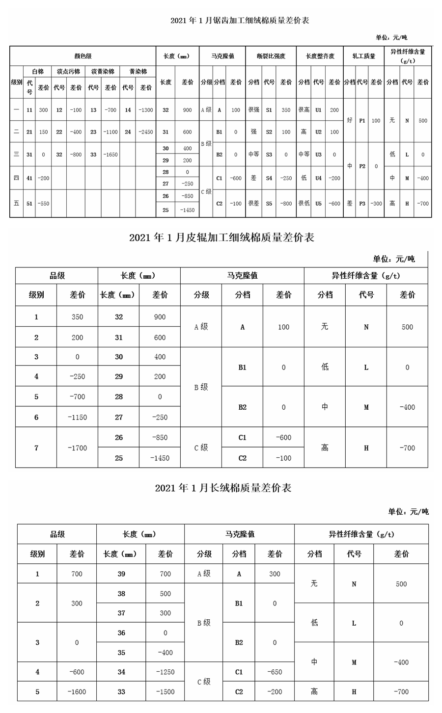 根据《中国棉花协会国产棉质量差价表管理办法》规定,现正式发布2021年1月《锯齿加工细绒棉质量差价表》、《皮辊加工细绒棉质量差价表》和《长绒棉质量差价表》(单位:元/吨)。