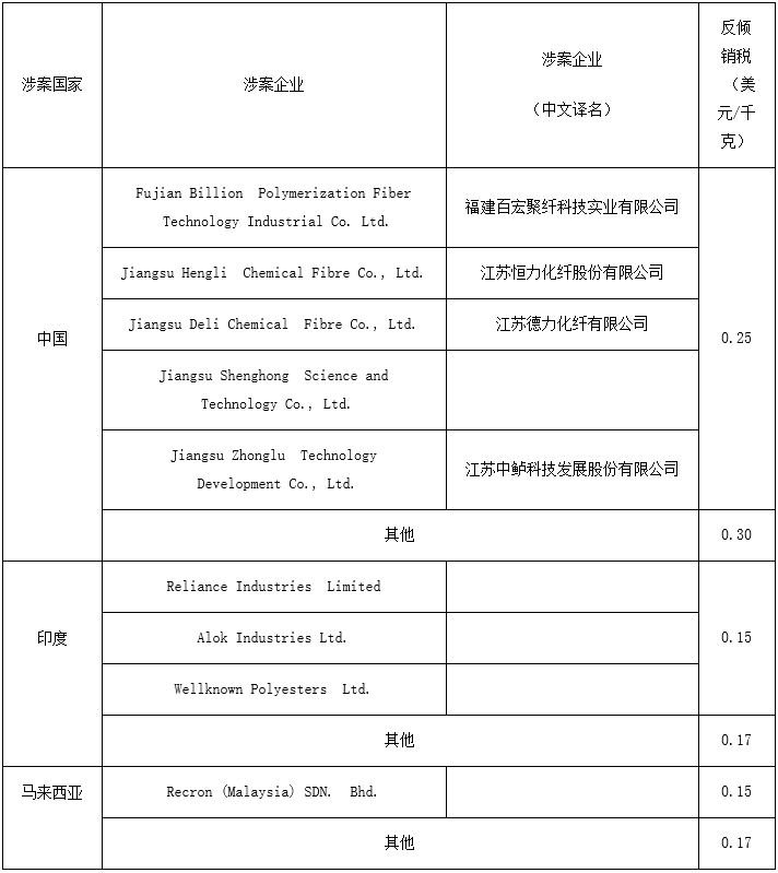 2021年1月9日,土耳其贸易部发布第2021/1号公告,对原产于中国、印度、马来西亚的聚酯合成长丝纱线作出第一次反倾销日落复审肯定性终裁,决定对上述三国涉案产品继续征收为期5年的反倾销税,中国为0.25美元/千克-0.30美元/千克、印度为0.15美元/千克-0.17美元/千克、马来西亚为0.15美元/千克-0.17美元/千克,税额详见下表。涉案产品的土耳其税号为5402.47。公告自发布之日起生效。