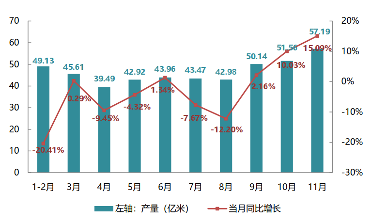 据国家统计局数据,1-11月规模以上印染企业印染布产量463.53亿米,同比减少7.21%,产量降幅较1-10月收窄1.65个百分点,生产呈现持续修复态势。9月以来,印染布当月产量均维持在50亿米以上,连续3个月保持正增长,同比增速分别2.16%、10.03%、15.09%。
