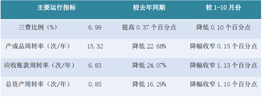 据国家统计局数据,1-11月规模以上印染企业三费比例6.99%,同比提高0.37个百分点,其中棉印染企业为6.74%,化纤印染企业为8.80%。产成品周转率15.32次/年,同比降低22.68%;应收账款周转率6.83次/年,同比降低24.07%;总资产周转率0.85次/年,同比降低16.29%。与1-10月相比,1-11月企业三费比例降低0.10个百分点;产成品周转率、应收账款周转率、总资产周转率降幅分别收窄0.15个百分点、1.13个百分点、1.10个百分点,降幅收窄幅度较1-10月有所放缓,分别放缓3.43、1.50、0.69个百分点。