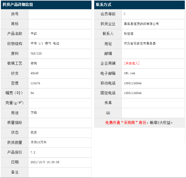 10月5日,高邑县恒茂纺织有限公司涤棉平纹T65/C35 45x45 110x76 94" 1/1 喷气 毛边,报价为7.2元/米,实际成交价以协商为准。[点击查看详情]