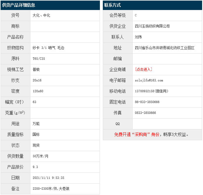 11月11日,四川玉扬纺织有限公司大化涤棉纱卡T65/C35 20x16 120x60 63" 3/1 喷气 毛边,报价为9.3元/米,实际成交价以协商为准。[点击查看详情]