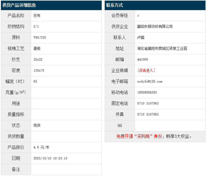 10月10日,襄阳东银纺织有限公司涤棉布T80/C20 32x32 130x70 63" 2/1,报价为4.8元/米,实际成交价以协商为准。[点击查看详情]