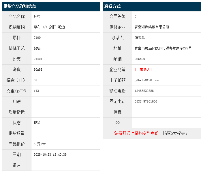 10月23日,青岛海岸纺织有限公司纯棉平布C100 21x21 60x58 63" 1/1 剑杆 毛边,报价为5元/米,实际成交价以协商为准。[点击查看详情]