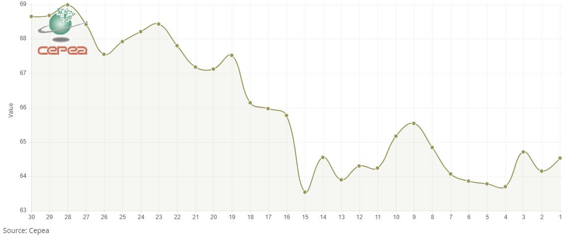 10月30日(周四),巴西CEPEA/ESALQ棉花价格指数报64.53美分/磅,较前一交易日上涨0.59%,较上月同期下跌5.70%。