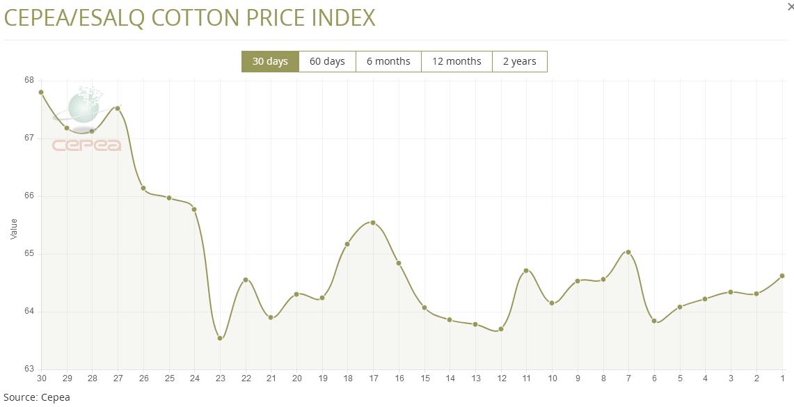 11月11日(周二),巴西CEPEA/ESALQ棉花价格指数报64.62美分/磅,较前一交易日上涨0.48%,较上月同期下跌0.09%。
