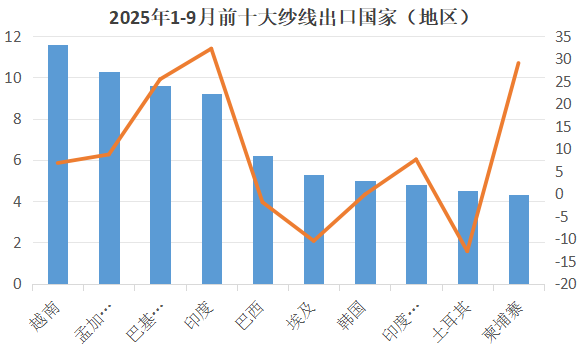 1-9月对巴基斯坦出口纱线9.6亿美元,同比增长25.4%。