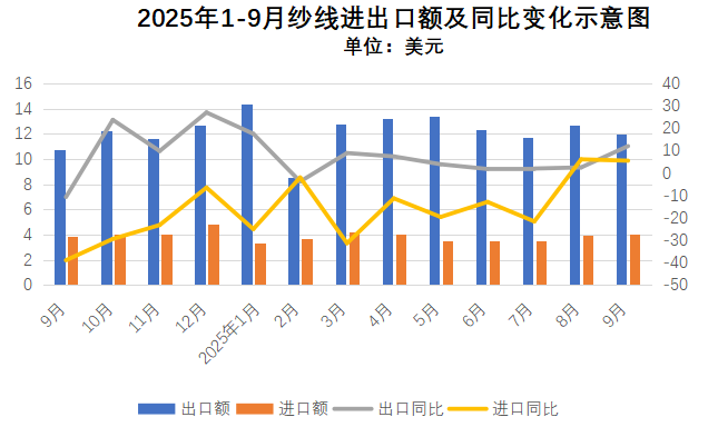 从纱线面料整体出口看,2025年1-9月我国纱线面料出口625.8亿美元,同比增长3.4%。从具体产品看,纱线出口111亿美元,同比增长6.0%,面料出口514.8亿美元,同比增长2.9%。