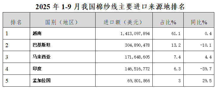 受美国关税政策不确定性影响,我国对美国纺织服装出口呈现下行趋势,进而导致进口纱需求持续萎缩。从大类产品看,2025年1-9月进口棉纱线23.1亿美元,同比下降14%,进口数量103.6万吨,同比下降7.4%;进口化纤8.9亿美元,同比下降17.1%;进口丝线和羊毛、动物纱线分别为215万美元、1.1亿美元,同比下降0.1%、增长17.1%。我国纱线进口以棉纱线为主,占纱线进口总额的70%。