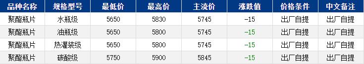 华东聚酯瓶片收于5745元/吨,涨跌值-15元/吨,原油拖累原料下滑,聚酯瓶片工厂多挺价报稳,市场重心窄幅下调。11-12月货源报盘5650-5800元/吨,局部略高5830元/吨或期货合约2601贴水20至升水60,递盘5670-5720元/吨。业内观望情绪浓厚,实单递盘零星。