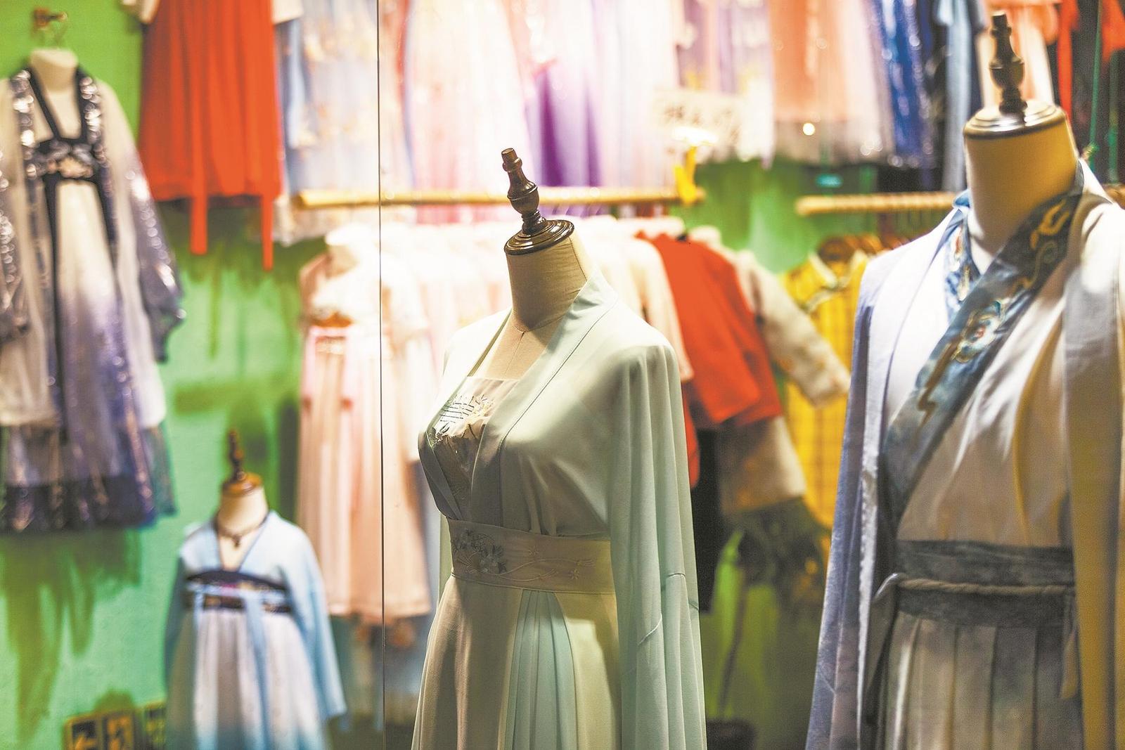 浙江省西塘古镇一家店铺内展示的丝绸服装