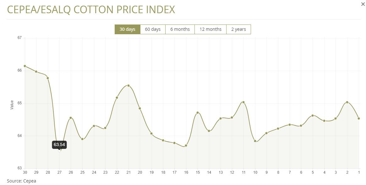 11月17日(周一),巴西CEPEA/ESALQ棉花价格指数报64.53美分/磅,较前一交易日下跌0.77%,较上月同期下跌0.05%。