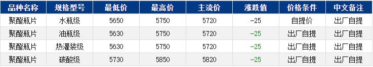 华东聚酯瓶片收于5720元/吨,涨跌值-25元/吨,原油、原料下跌,聚酯瓶片工厂部分持稳,部分下调50元/吨,市场重心窄幅下滑。11-12月货源报盘5630-5750元/吨,局部略高5800元/吨或期货合约2601贴水10至升水50,递盘5660-5710元/吨。