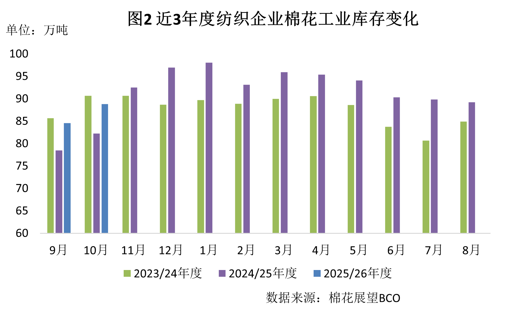 新棉大量上市,市场上可选资源增多,有补库需求的纺纱厂开始采购,原料库存有所上升。截至10月底纺织厂在库棉花工业库存量为88.8万吨,较上月底增加4.3万吨。纺织厂可支配棉花库存量为106.7万吨,较上月底增加3.4万吨。其中:38%企业增加棉花库存,16%减少,46%基本保持不变。尽管新棉供应充足,但随着下游即将进入传统淡季,企业补库持续性仍需观察。