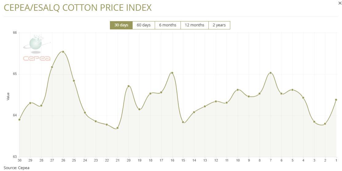 11月25日(周二),巴西CEPEA/ESALQ棉花价格指数报64.38美分/磅,较前一交易日下跌0.91%,较上月同期下降0.28%。