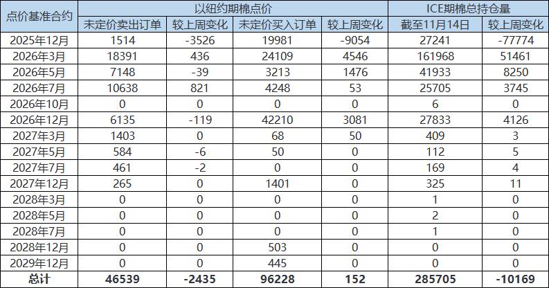 所有期棉合约点价未定价卖出订单共46539手,较前周减少2435手。