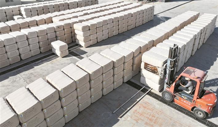 11月28日,在七师一三一团奎屯锦姿棉业有限公司轧花厂,工人操作叉车码放皮棉。新棉收购开展以来,该轧花厂平均日加工皮棉42吨,截至目前已完成1.6万吨籽棉收购加工任务。