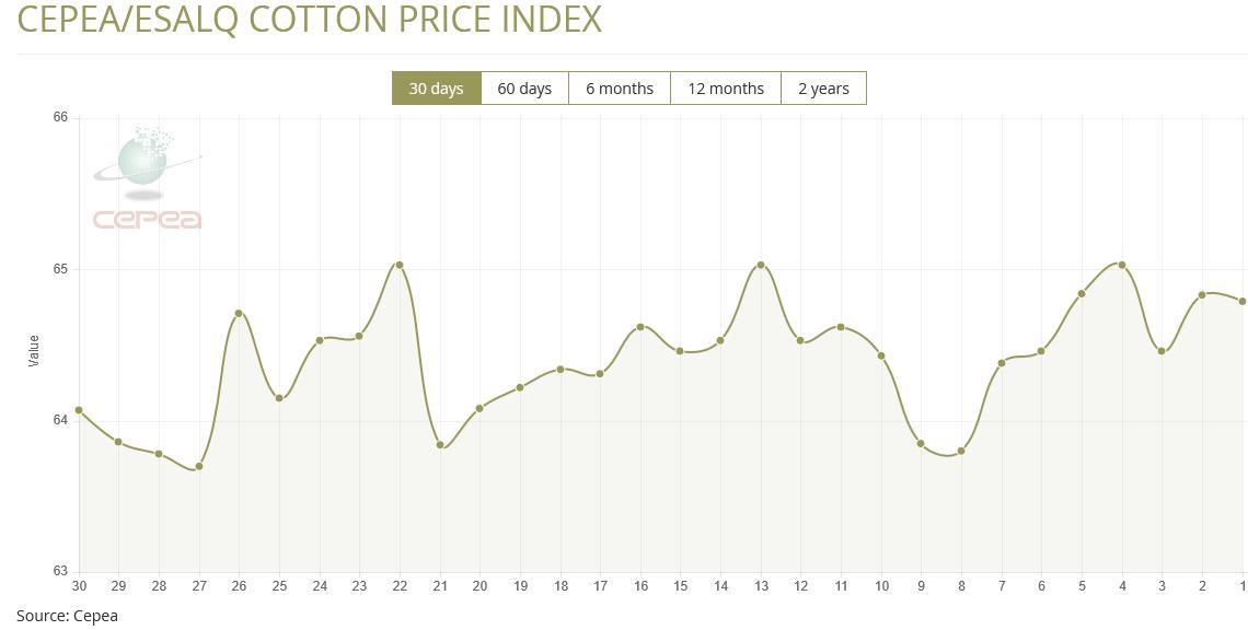 12月3日(周三),巴西CEPEA/ESALQ棉花价格指数报64.79美分/磅,较前一交易日下滑0.06%,较上月同期下跌0.37%。