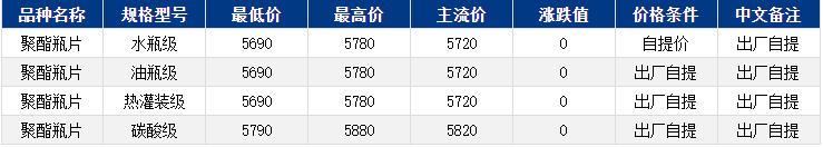 华东聚酯瓶片收于5720元/吨,涨跌值0元/吨,原料支撑坍塌,聚酯瓶片工厂报价多下调50元/吨,市场重心暂时持稳,12月货源报盘5690-5770元/吨,局部略低5630元/吨,略高5800元/吨或期货合约2602贴水30至升水50,递盘5660-5750元/吨,低价递盘为主。