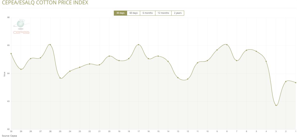 12月9日(周二),巴西CEPEA/ESALQ棉花价格指数报63.67美分/磅,较前一交易日下滑0.06%,较上月同期下滑2.09%。