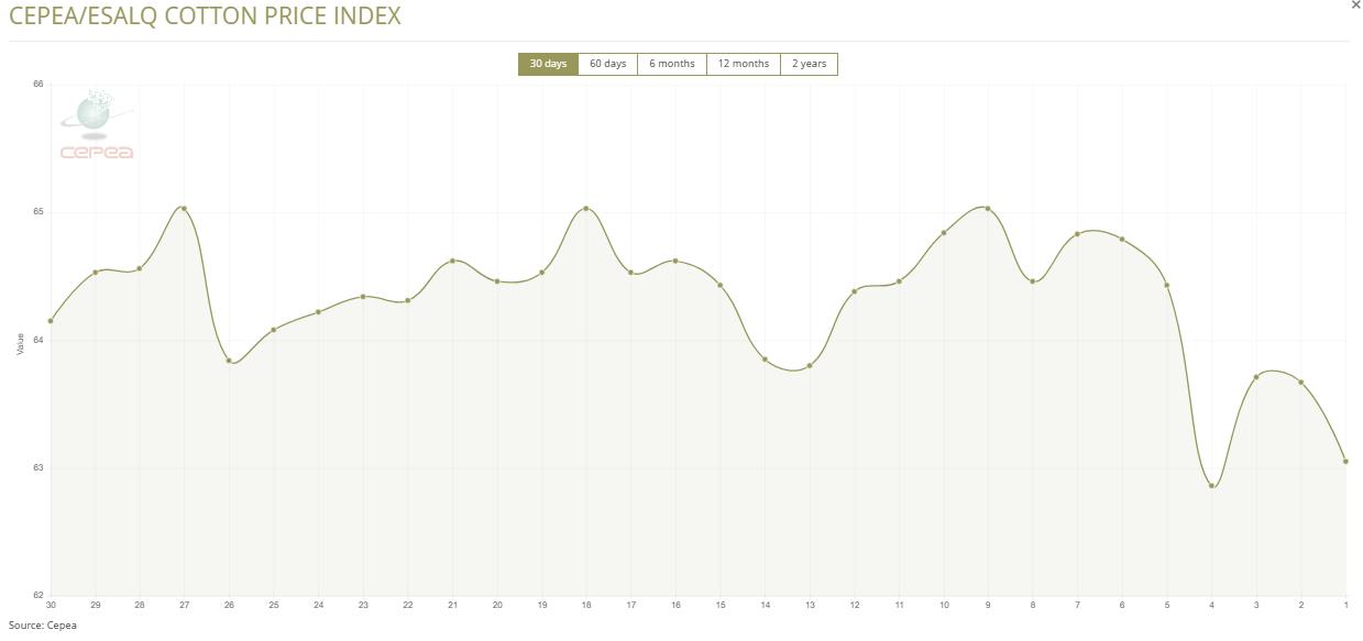12月10日(周三),巴西CEPEA/ESALQ棉花价格指数报63.05美分/磅,较前一交易日下滑0.97%,较上月同期下滑3.04%。