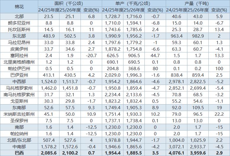 2025/26年度巴西棉花种植面积预估为210.02万公顷,同比增加0.7%,上一年度为208.56万公顷。