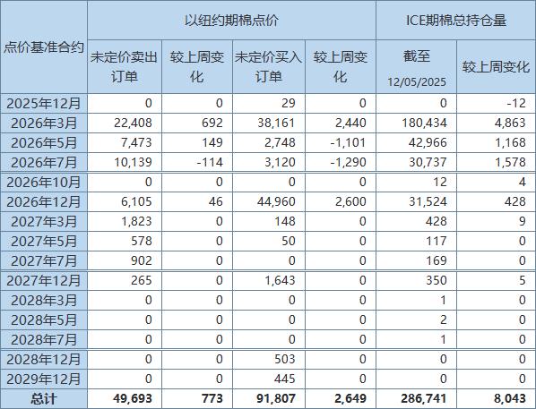 美国商品期货交易委员会(CFTC)公布,截至12月5日,以ICE期棉2026年3月合约点价未定价卖出订单(UnfixedCallSales)较前周增加692手至22408手。