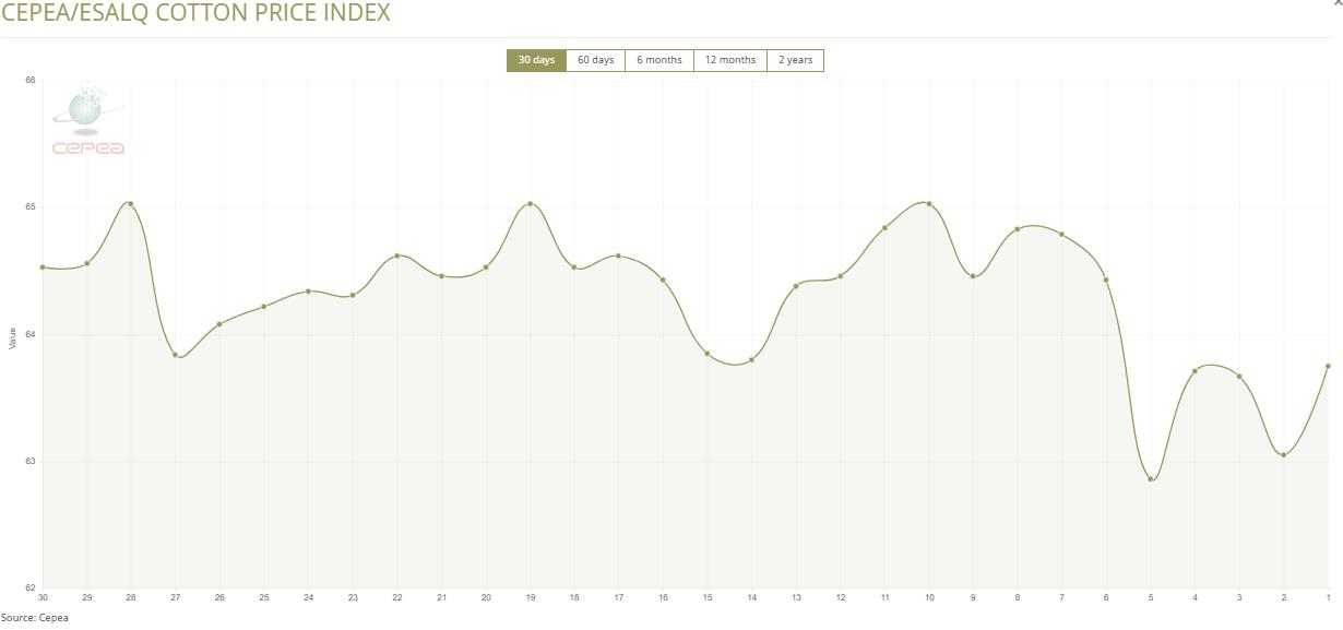 12月11日(周四),巴西CEPEA/ESALQ棉花价格指数报63.75美分/磅,较前一交易日上涨1.11%,较上月同期下滑1.97%。