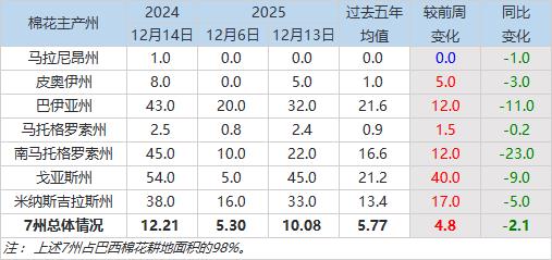 12月15日(周一),巴西国家商品供应公司(Conab)公布的数据显示,截至2025年12月13日当周,2025/26年度巴西棉花种植率为10.1%,前周为5.3%,上年同期为12.2%,五年均值为5.8%。