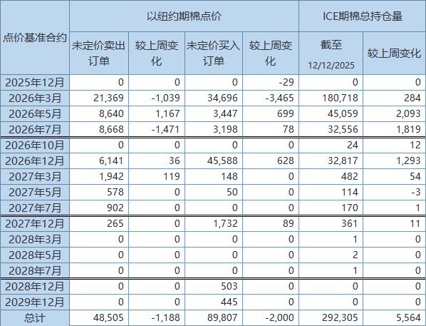 美国商品期货交易委员会(CFTC)公布,截至12月12日,以ICE期棉2026年3月合约点价未定价卖出订单(UnfixedCallSales)较前周减少1039手至21369手。
