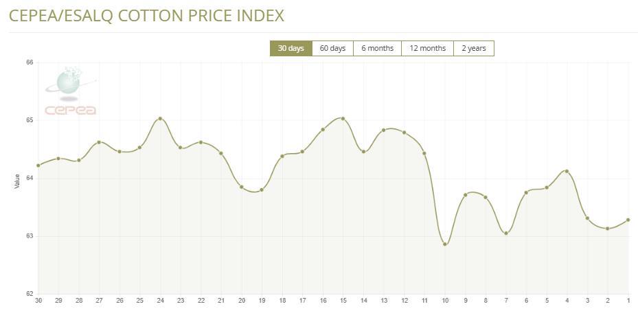 12月18日(周四),巴西CEPEA/ESALQ棉花价格指数报63.28美分/磅,较前一交易日上涨0.24%,较上月同期下滑2.69%。