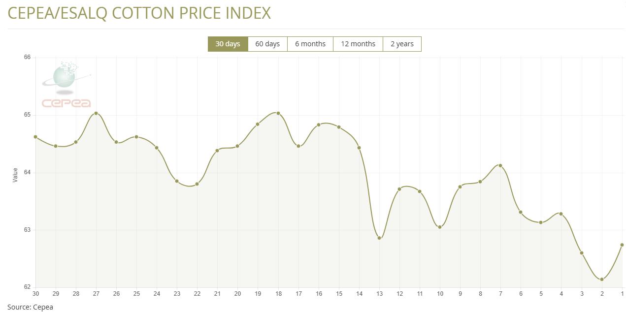 12月23日(周二),巴西CEPEA/ESALQ棉花价格指数报62.74美分/磅,较前一交易日上涨0.97%,较上月同期下滑3.52%。