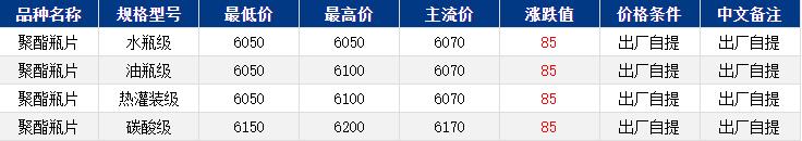 华东聚酯瓶片收于6070元/吨,涨跌值85元/吨,PTA某300万吨装置因故障停车,原料再度拉涨至阶段内高位。成本推动下,聚酯瓶片工厂报价上调,重心随之上扬。12-1月货源报盘6050-6100元/吨,递盘6040元/吨;2-3月货源报盘6070-6120元/吨,递盘6070元/吨,观望情绪浓厚,实单递盘零星。