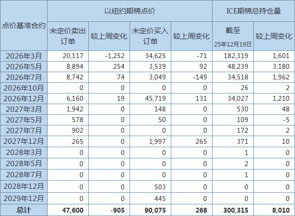 所有期棉合约点价未定价卖出订单共47600手,较前周减少905手。