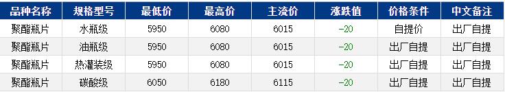 华东聚酯瓶片收于6015元/吨,涨跌值-20元/吨,原油拖累原料下行,聚酯瓶片工厂报价多下调10-20元/吨,重心下滑。临近元旦小假期,业内接盘意愿不高。12-1月货源报盘5950-6080元/吨,递盘5960-5990元/吨。