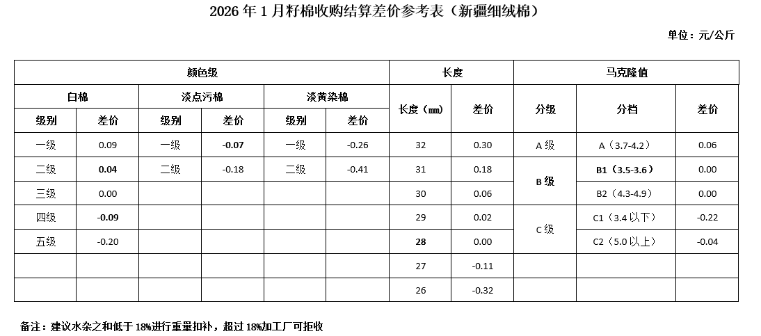 根据《中国棉花协会籽棉收购结算差价参考表(新疆细绒棉)管理办法》规定,现正式发布2026年1月《籽棉收购结算差价参考表(新疆细绒棉)》(单位:元/公斤),为新疆地区籽棉收购提供参考。