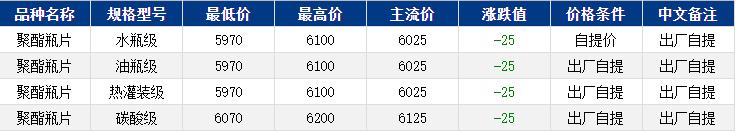 华东聚酯瓶片收于6025元/吨,涨跌值-25元/吨,聚酯产业链全线偏弱震荡,聚酯瓶片重心窄幅下行,1月货源报盘5970-6100元/吨或期货合约2603贴水30至升水30,零星递盘6030元/吨,持货商出货为主。