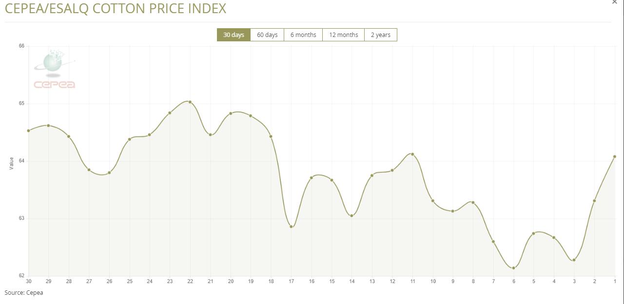 2026年1月2日(周五),巴西CEPEA/ESALQ棉花价格指数报64.08美分/磅,较前一交易日(2025年12月30日)上涨1.22%,较上月同期上涨1.22%。